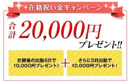 | バックシステム | ■在籍祝い金プレゼントキャンペーン■ 合計20,000円プレゼント 【5日出勤で10,000円+さらに5日出勤で10,000円】 昼の12時から勤務出来て19時には終わるので、彼氏や親にもバレにくい!! |